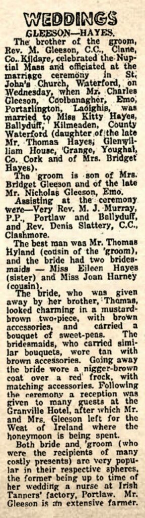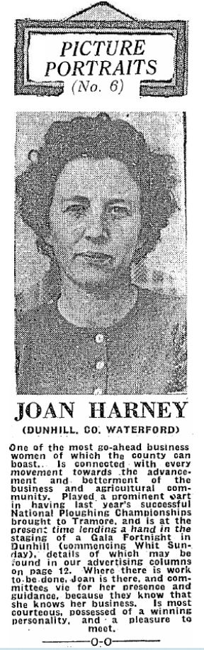 In addition to the details reported in the Waterford News, for many years the bride’s widowed mother Bridget ran a grocery and bakery business in Ballyduff with her daughter Eileen. The other bridesmaid was the well-known Joan Harney, Dunhill (profiled in The Munster Express in 1959, right).