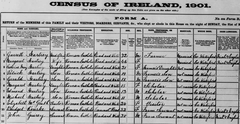 Members of the Hartrey (Hartery/Hartry) family — namely William, Nicholas, and John — were recorded as leasing houses from the Lane-Fox Estate at Carriganard, Butlerstown, in 1848.