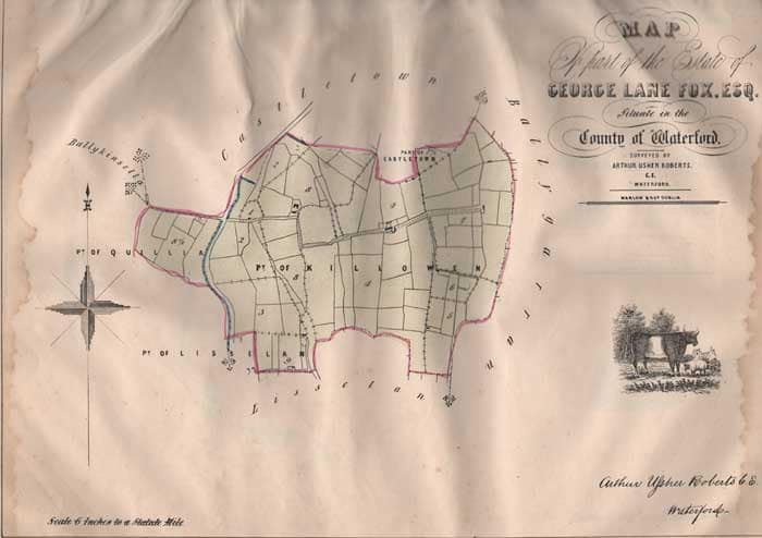 Their estates (which would amount to over 5,000 acres in Waterford in the 1870s) were managed by a succession of agents in subsequent eras. By the mid-19th century Griffith’s Valuation, Yorkshire MP George Lane-Fox was among the principal lessors in the Waterford parishes of Drumcannon and Kilburne, Barony of Middlethird. Two years earlier, in 1848, he also held townlands in the parish of Kilbarry, barony of Gaultiere.