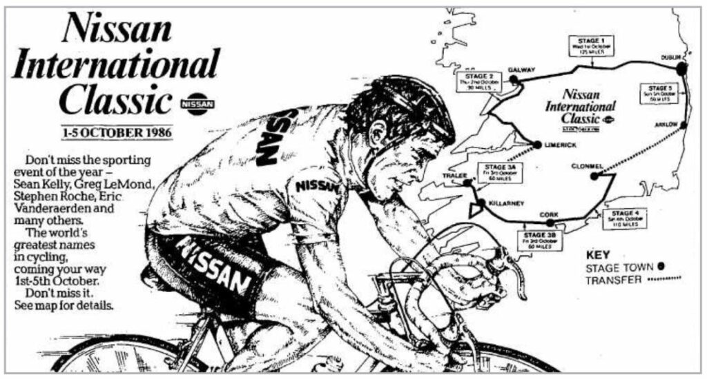 Surviving two heavy falls in Cork and Clonmel en route to overall victory, Kelly’s speciality as a sprinter enabled him to collect enough time bonuses on the final stage to just pip Canada’s Steve Bauer.