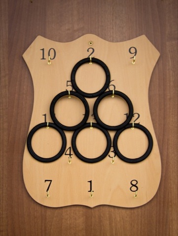 This rudimentary but deceptively difficult game involved throwing rubber rings at a board from a set distance (called the oche, as in darts), with small hooks positioned at each number, from 1-13. You had to hang your ring on the hook to make it count.