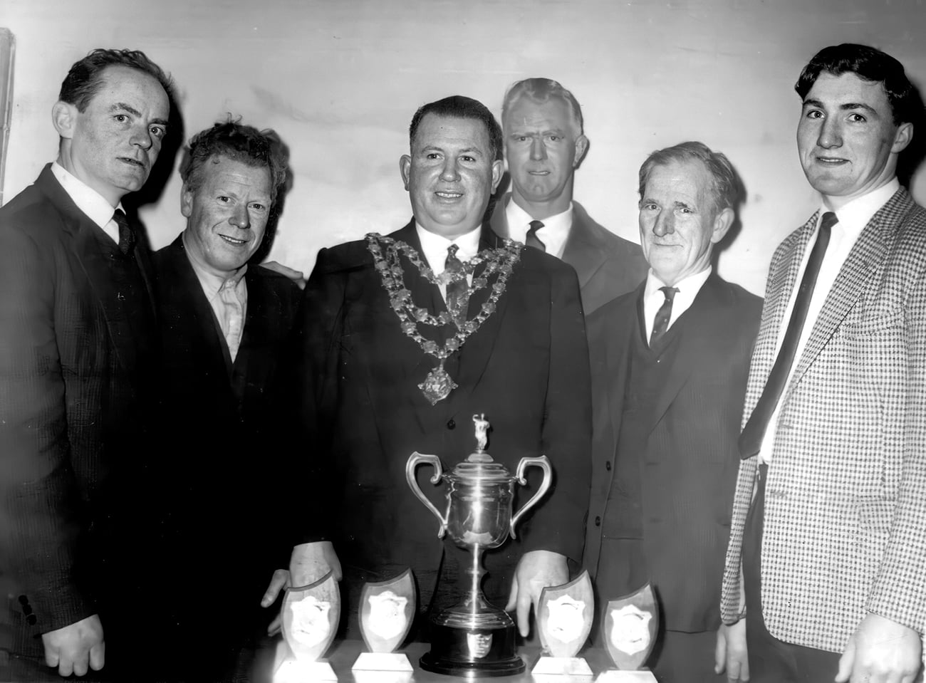 The above photograph shows the ringleaders, namely, from left: Maxi Carberry, Loughdaheen; John Joe (Chops) Power, Adamstown; Mayor of Waterford, Colr. Patrick “Fad” Browne, who made the presentations; publican Tommy Hayes, The Sweep; Peter Kiely, Adamstown; and Michael O’Keeffe, Lisnakill.